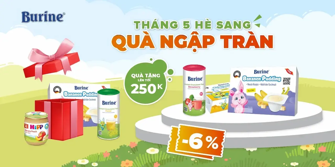 Mua 2 trà cốm hoa quả Burine nhận 1 vỉ pudding Burine dâu tây trị gái 95.000đ Ưu đãi cháo sữa, pudding Burine – Mua 2 vỉ nhận 1 lọ trái cây nghiền Organic – Mua 3 vỉ nhận 1 dầu ăn dặm cho bé – Mua 8 vỉ nhận bánh quy ăn dặm + trà Burine trị giá 295K